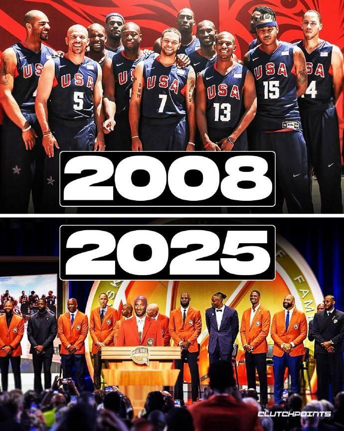 在2025年奈史密斯篮球名人堂入选仪式上,2008年北京奥运会美国男篮队解体入选,除了已经意外去世的科比,08梦之队的其余11位成语也都全部出席了入选仪式,包括安东尼和霍华德这两位同时以个人身份入选名人堂的球员。